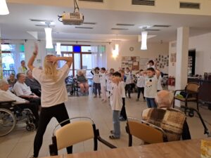 Naše škola se během podzimních měsíců zapojila do mezigeneračního projektu Povídej, který probíhá pod záštitou neziskové organizace Mezi námi, o. p. s. Spolupráci jsme navázali s domovem Alzheimer Home Sychrov. První společné setkání se uskutečnilo v listopadu. Děti si pro klienty připravily taneční vystoupení, společně si zacvičily a následně se zapojily do tvořivé aktivity, při které vznikly symbolické spojené dlaně přátelství. Tento týden proběhlo další, lednové setkání, během něhož si děti se seniory zahrály společenské hry a opět jim zatančily. Setkání se neslo v příjemné a přátelské atmosféře plné radosti a vzájemného sdílení. Tato setkání jsou pro děti velmi přínosná – učí se úctě, empatii, trpělivosti, spolupráci a komunikaci s jinou věkovou skupinou. Seniorům naopak přinášejí radost, úsměv a dobrý pocit z možnosti sdílet své zkušenosti a být součástí společného programu. Na další setkání se už nyní velmi těšíme. Tradičně se také v předvánočním období vydáváme s dětmi do domova seniorů ve Vlastibořicích, kde zpíváme vánoční koledy a předáváme klientům malé dárečky, které jim zpříjemní adventní čas.